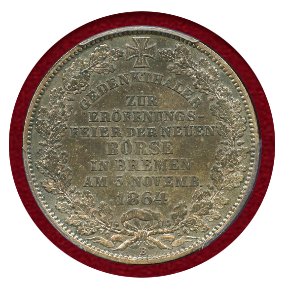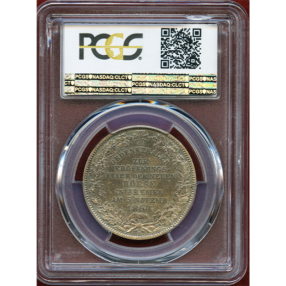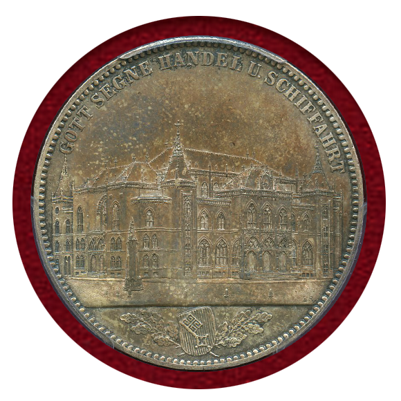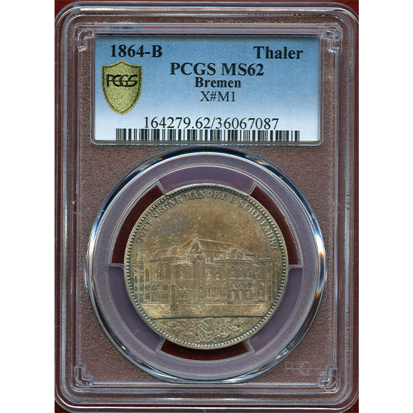 1864年11月にドイツ ブレーメンに建築された新証券取引所を記念して発行された人気のターラー銀貨です。
