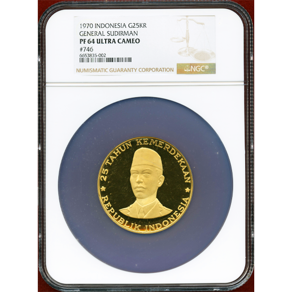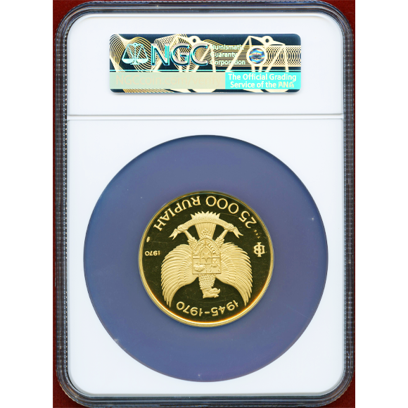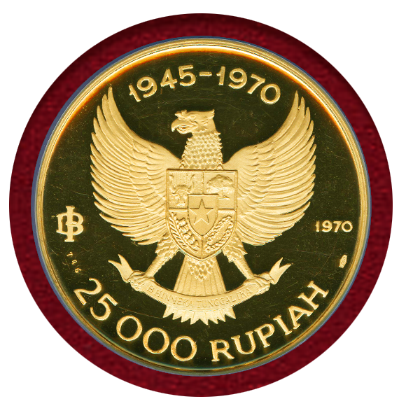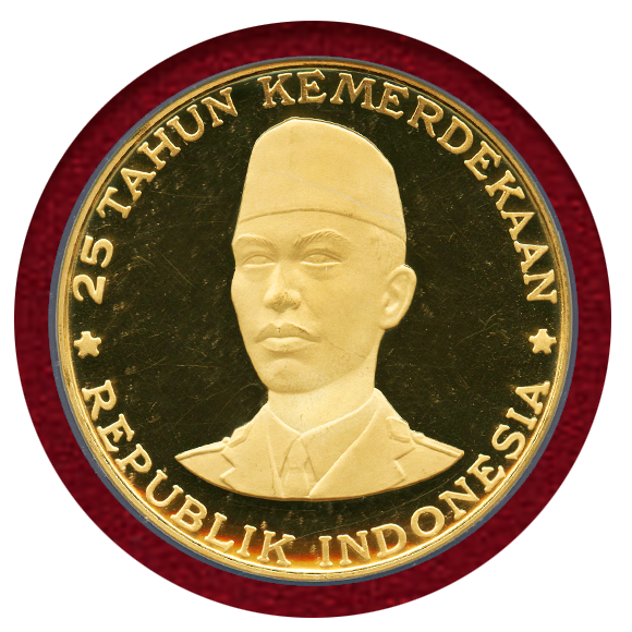 インドネシアの独立25周年記念を記念して発行されたコインセットの中の最高額面である25,000ルピア金貨です。