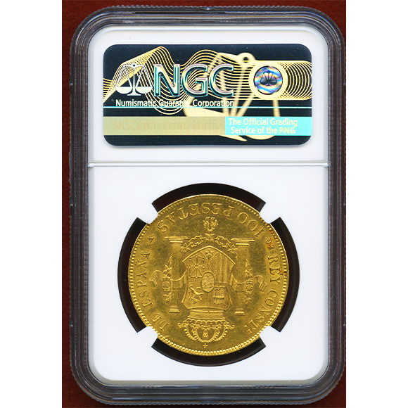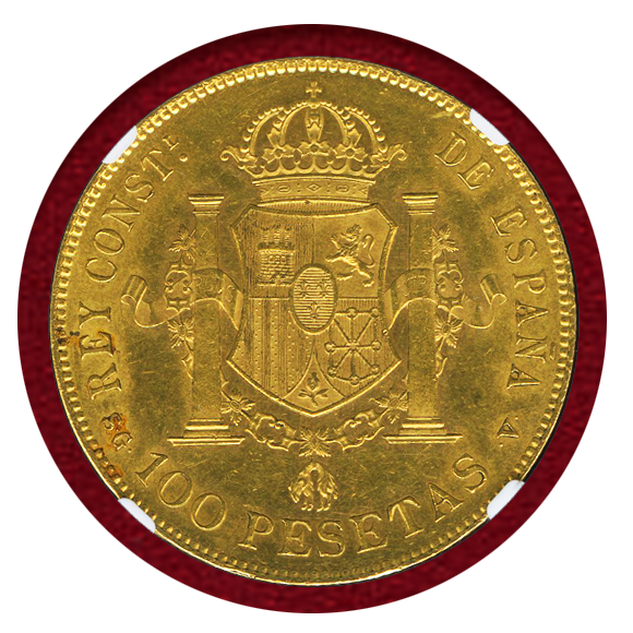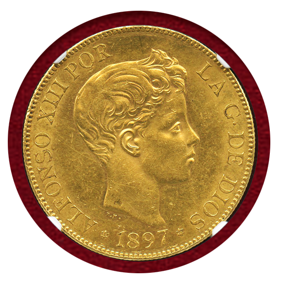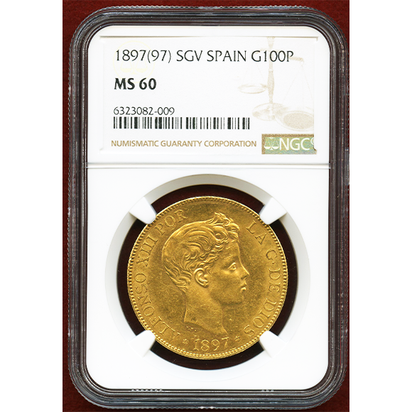 同様の意匠のリストライクが存在していますが、こちらは1897年に発行された希少なオリジナルの100ペセタ金貨です。