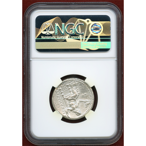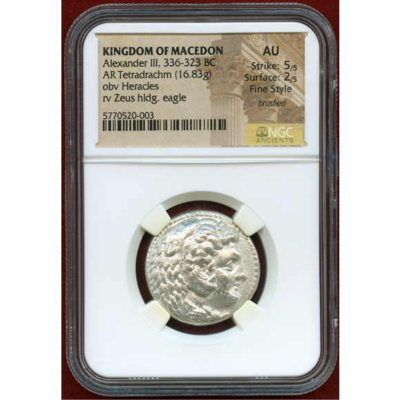 表面は、ライオンの頭飾りを身に着けているヘラクレスの右向き頭像、裏面は右手に鷲、左手に王笏を持つゼウスが描かれています。