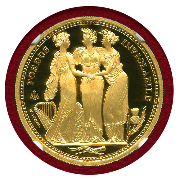 中央にイングランド、左側にアイルランド、右側にスコットランドを擬人化した女神が、地域を象徴する盾、ハープ、アザミと共に描かれています。