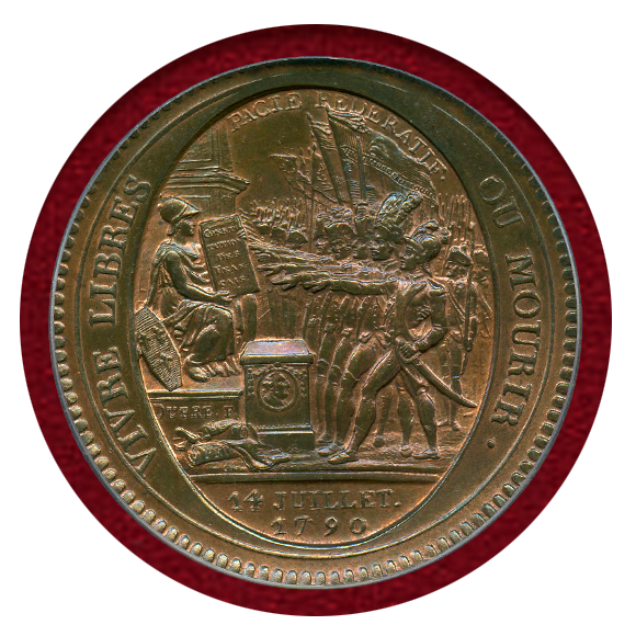 表面には1790年7月14日建国記念日1周年を祝う式典会場にてフランス新憲法書を捧げ持つ女神に忠誠を誓う兵士達が描かれています。