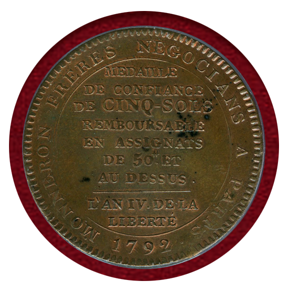 1792年からフランスでの小額貨幣の不足などを受けて、モネロン商会は銅の交換用トークン/メダルの発行を開始しました。