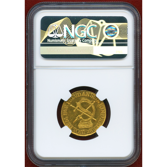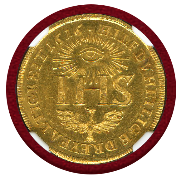 全能の神の目(プロビデンスの目)、「IHS」(イエス・キリストの意味)のイニシャル、平和の象徴としての鳩、反対面には2本の剣の上に選挙帽、CSのモノグラムが描かれています。