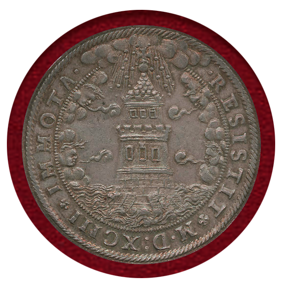 スラブ裏面:四方の風、波、雨に翻弄される大きな塔が描かれ、その周りに「RESISTIT M · D : XCIII IMMOTA」(訳 動かずに抵抗する 1593)と書かれています。