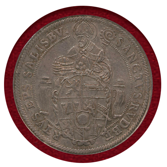 スラブ表面:聖ルパードが塩箱と杖を持ち、楕円形の盾の上の玉座に座っています。盾には7つの紋章が描かれています。それぞれ、ザルツブルク大司教区の紋章、3ライトナウ家の紋章トゥールガウのエシェンツ領主の紋章、そしてヴォルフ・ディートリッヒ家の紋章です。