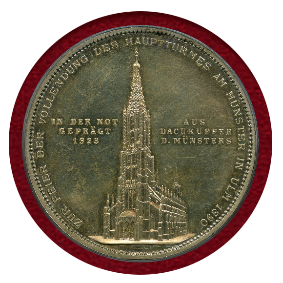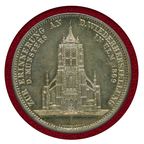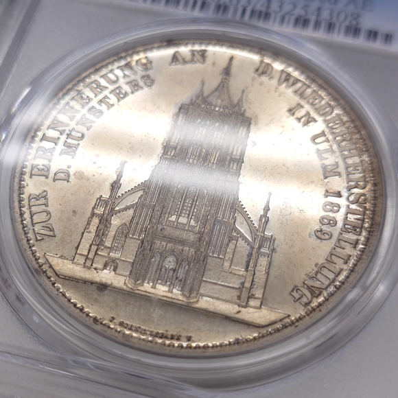 ウルム大聖堂を正面にみた意匠は、1869年/1871年の2ターラー銀貨が有名ですが、こちらのメダルは裏面に斜めから見た大聖堂も描かれており、その奥行きをみることができます。