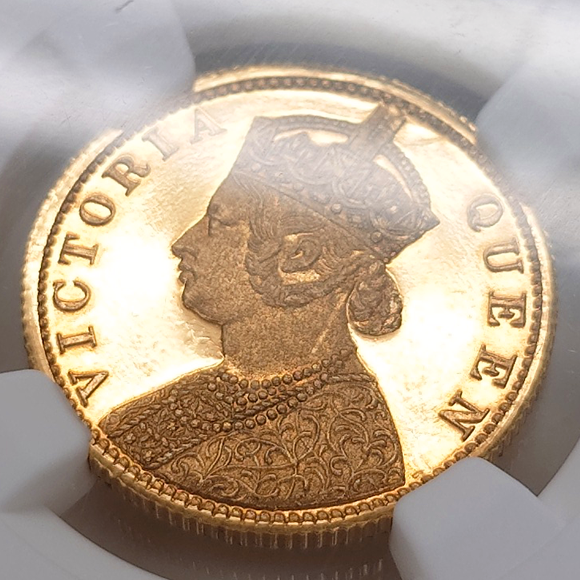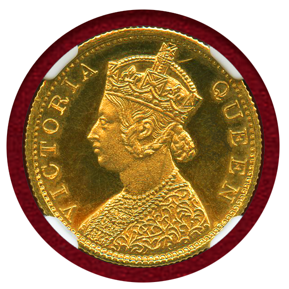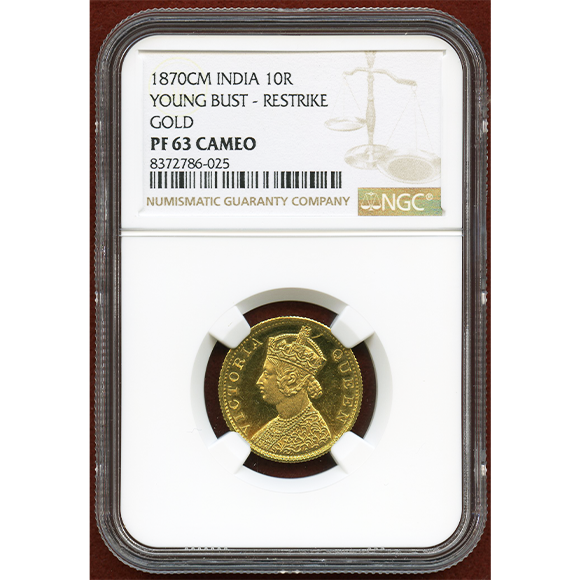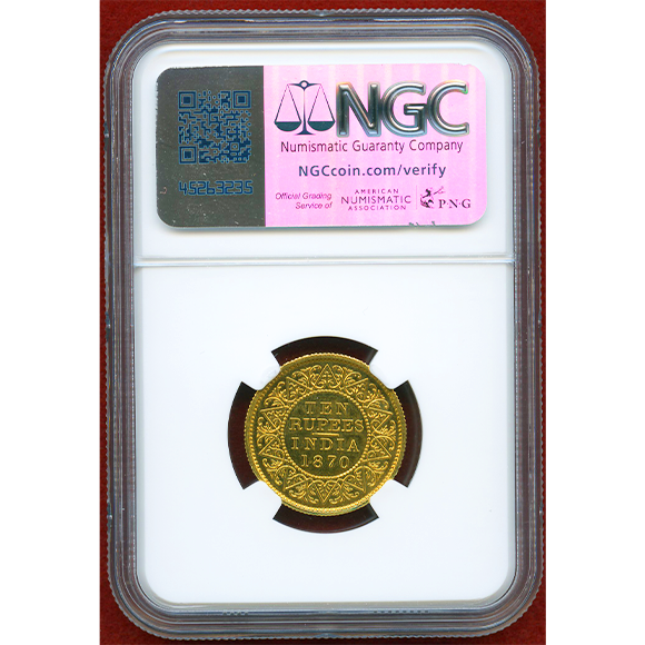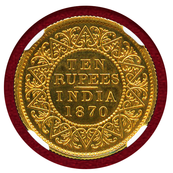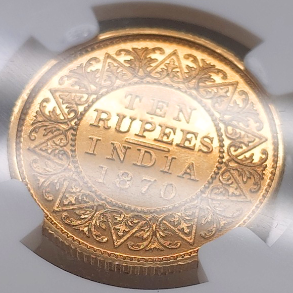 1870年銘の英領インド、カルカッタミント、ギザエッジの10ルピー金貨リストりライクです。リストライクとはいえ、希少金貨で国内外で人気の高い金貨と言えます。