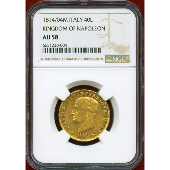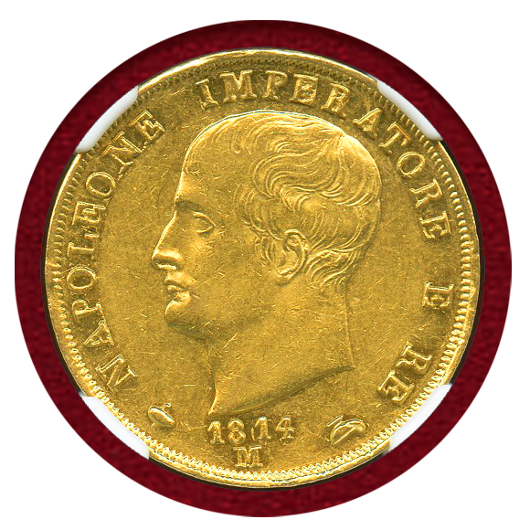 ナポレオンのイタリア王国での戴冠式(1805年)の2年後の1807年からナポレオン退位の1814年まで発行されました。本コインは最終年号となります。