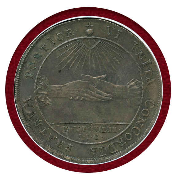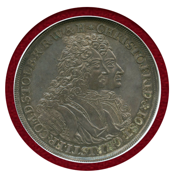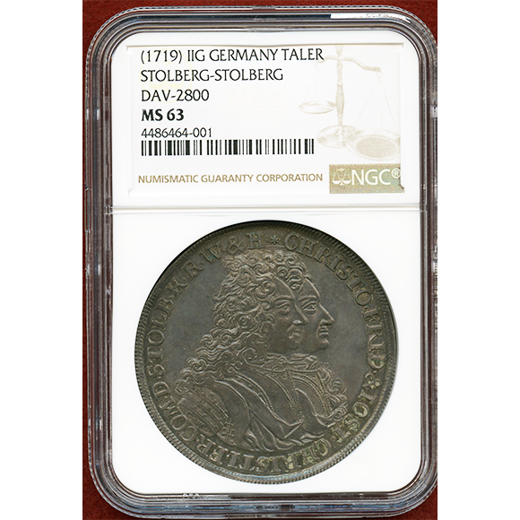 1719年7月6日、クリストフ・フリードリヒとヨスト・クリスチャンの間で締結されたシュトルベルク家の分割契約を記念して発行されたターラー銀貨です。