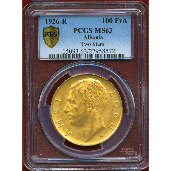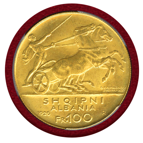 オモテ面は、当時アルバニア共和国の大統領、アフメト・ゾグの肖像、ウラ面には2頭立ての戦車であるヴィガが描かれています。