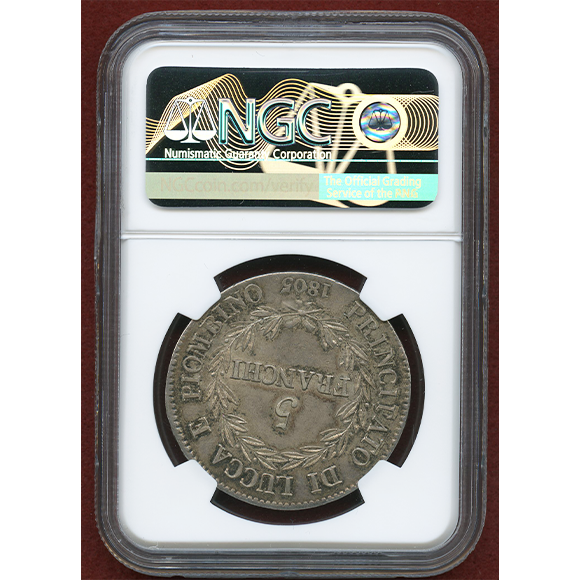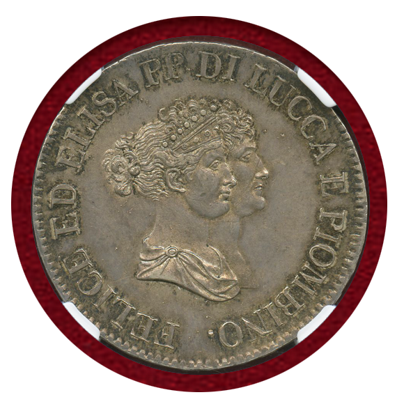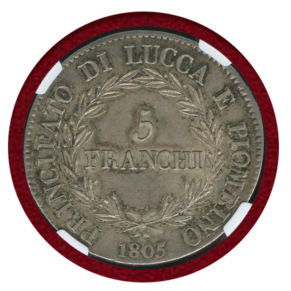 イタリア、ルッカ(ルッカおよびピオンビーノ公国)で発行された5フラン銀貨。