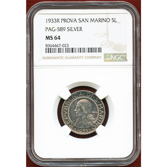サンマリノ 1933R PROVA(試作) 5リレ 銀貨 NGC MS64