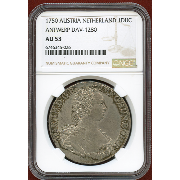 通常のターラーとは異なり、単位もオランダの通貨であったドゥカトンとなっています。また、肖像や裏面の紋章もヨーロッパで量産されたテレジアターラーとは異なり趣のあるコインです。アントワープミント。