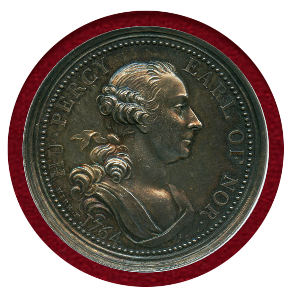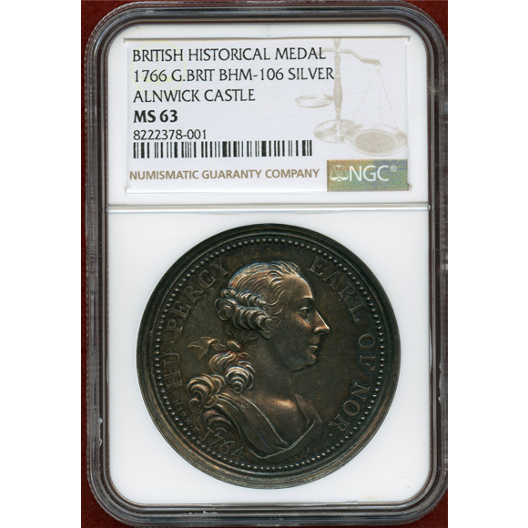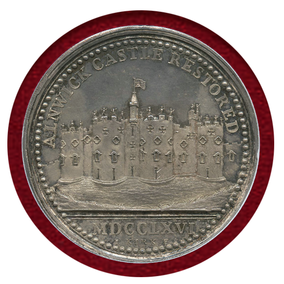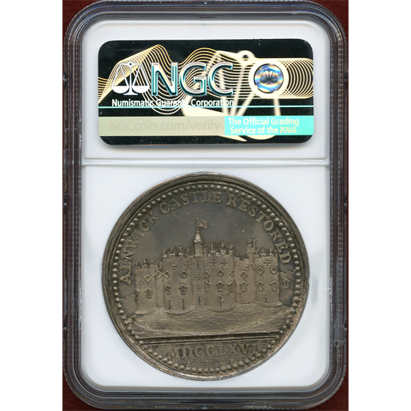 メダルの肖像は城主のノーサンバーランド公爵の胸像、裏面は1700年代当時のアニック城が描かれています。