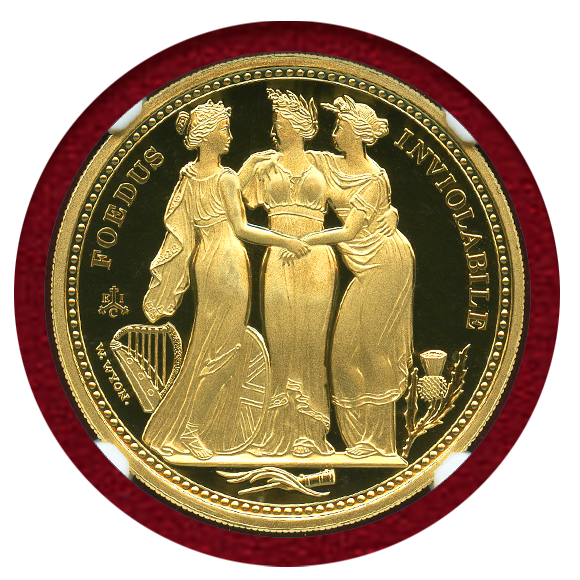 中央にイングランド、左側にアイルランド、右側にスコットランドを擬人化した女神が、地域を象徴する盾、ハープ、アザミと共に描かれています。