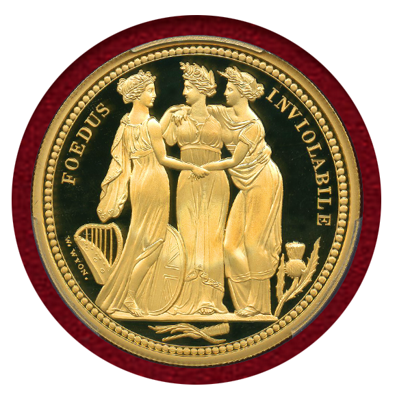 名匠ウィリアムワイオン作の中でも、極めて評価が高いスリーグレーセスのデザインを再現した、5ポンド金貨です。