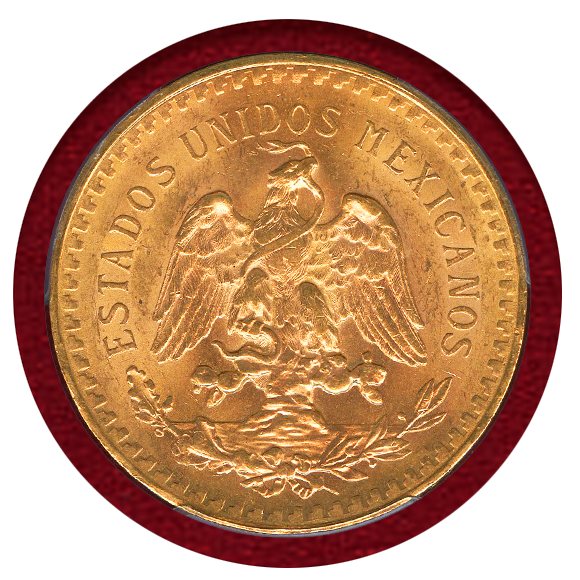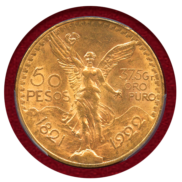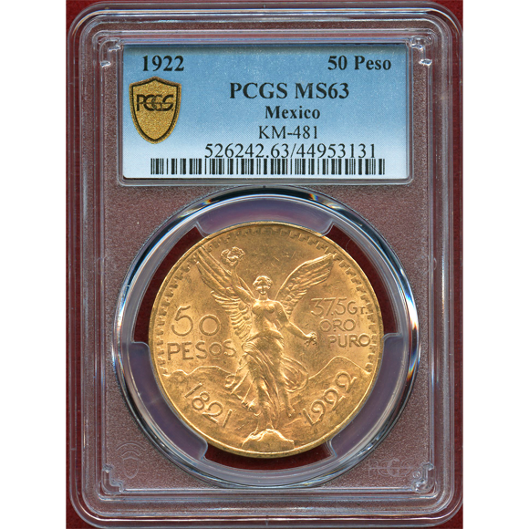スペインからの独立100年を記念して、1921年から1947年銘まで発行されたメキシコを代表する大型金貨です。