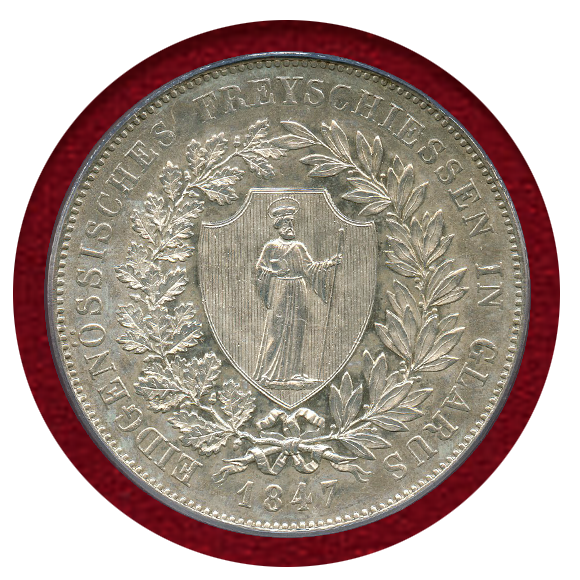 連邦射撃祭シリーズの中でゾロトゥルン 5フラン銀貨と並び、収集の最難関とされるコインです。発行枚数が元々3,200枚と極めて少ないですが、その内1852年に1,000枚以上が溶解されていると言われています。