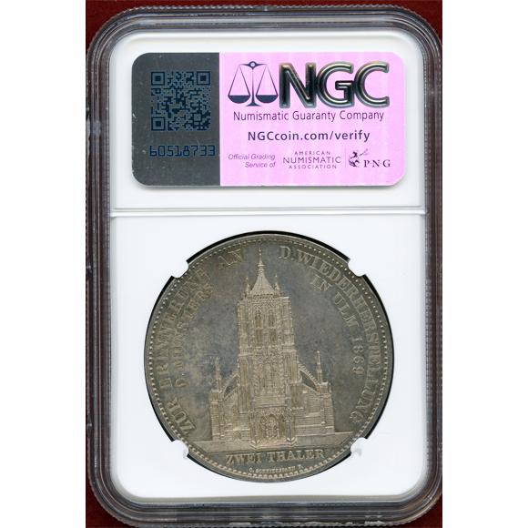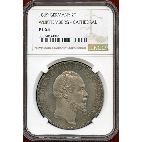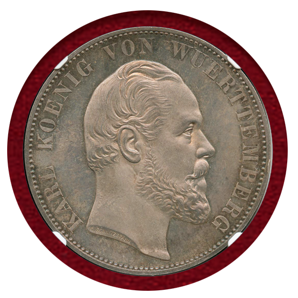 ドイツ、ヴュルテンベルクにあるウルム大聖堂の修復を記念して発行された2ターラー銀貨。肖像はヴュルテンベルク王国の国王であるカール1世です。