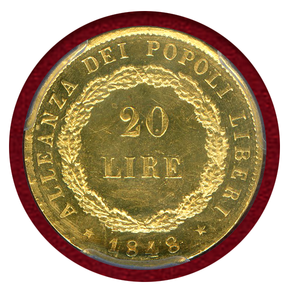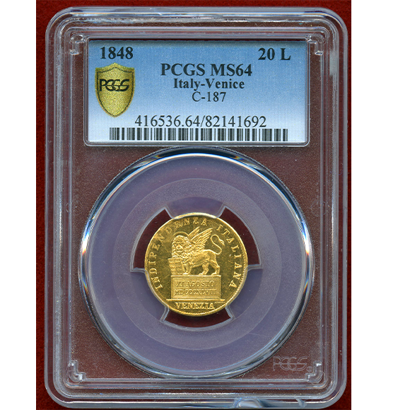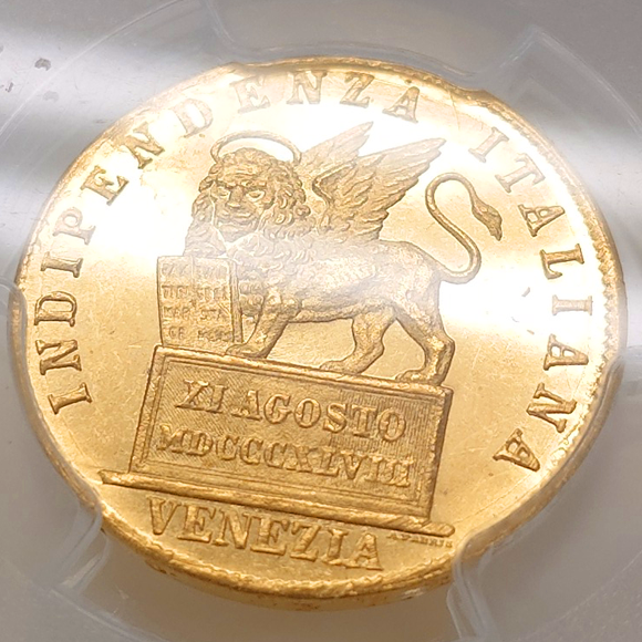 ヴェネツィア臨時政府による革命共和国を記念して鋳造された希少な20リレ金貨。