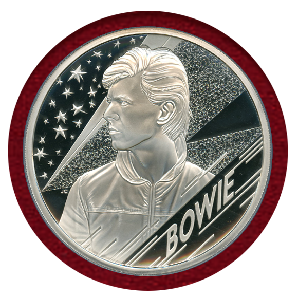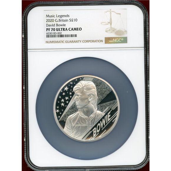 イギリス、ミュージックレジェンドシリーズ、デヴィッド・ボウイの5オンス10ポンド銀貨です。PF70ULTRA CAMEOのパーフェクト品です。