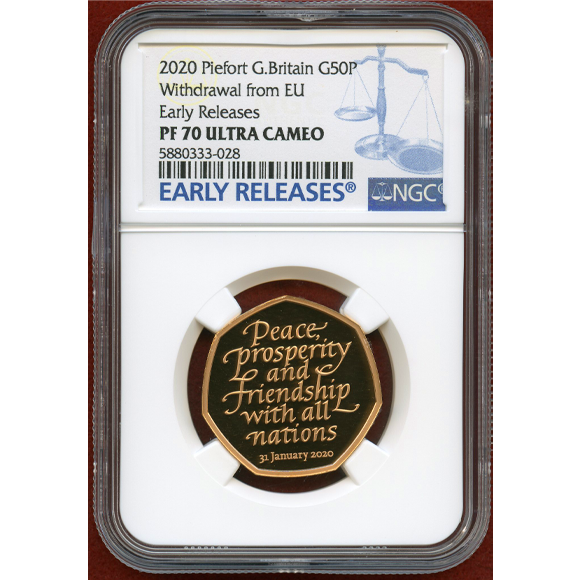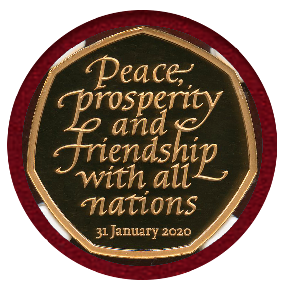 2020年、イギリスの欧州連合離脱、いわゆるブレグジットを記念して発行された金貨です。7角形で特徴的なコイン。