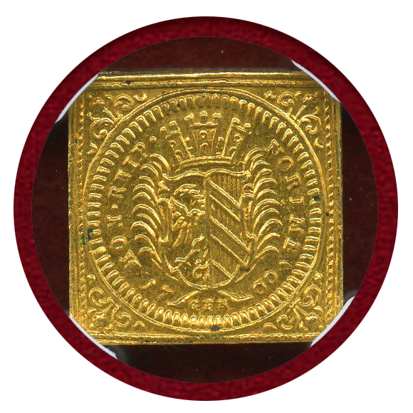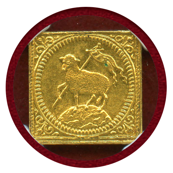 神の子羊が平和の旗を持って地球の上を歩く図案の人気金貨です。通称ラムダカット(1/2ダカット)。四角のクリッペタイプです。