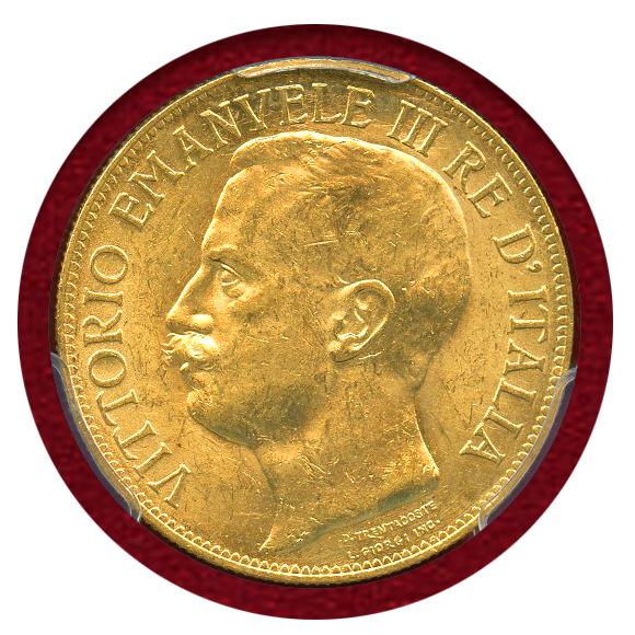 ヴィットリオエマヌエレ3世治世時には、芸術的な素晴らしいコインが多く造られていますが、その中でも魅力的で美しいデザインで人気の高い金貨です。