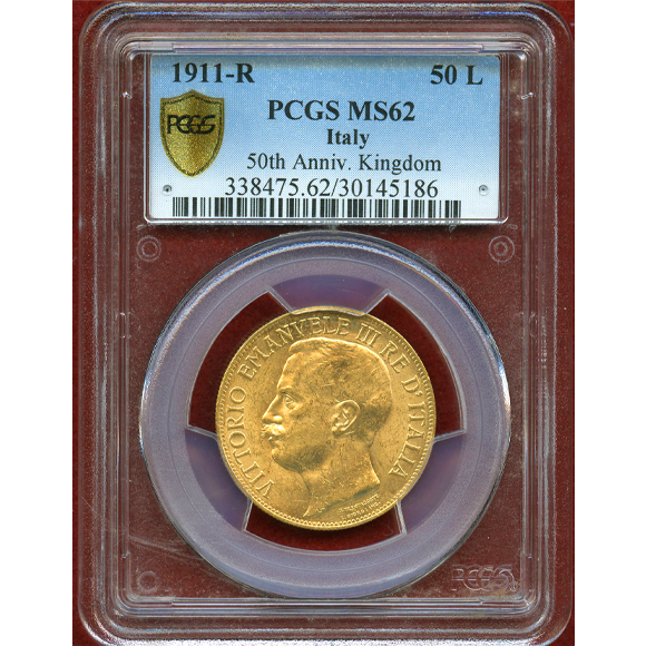 【SOLD】イタリア 1911R 50リレ 金貨 王国建国50周年記念 PCGS MS62