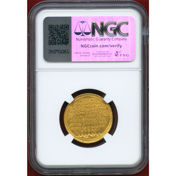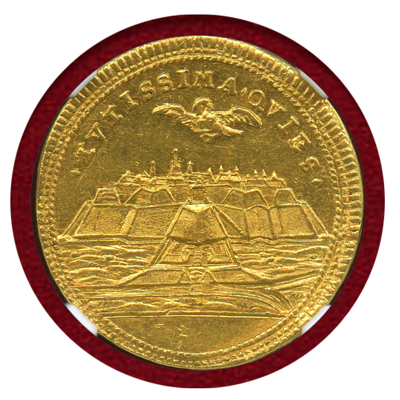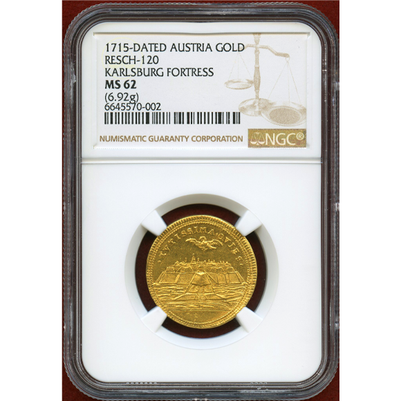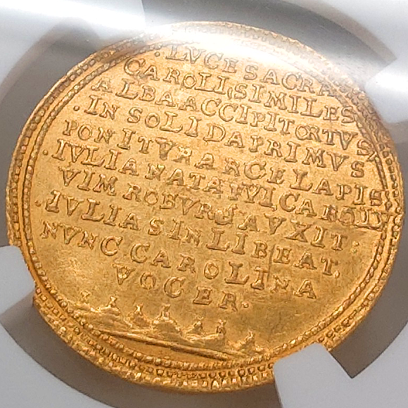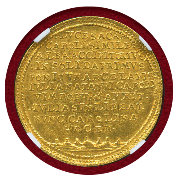 ハプスブルク家によるこの地域の軍事防衛強化の一環としてトランシルヴァニア地方(現ルーマニアの一部)にカールスブルク要塞(アルバ・カロリーナの要塞とも)を築きました。このメダルはその建設記念として製作された希少な2ダカット金メダルです。