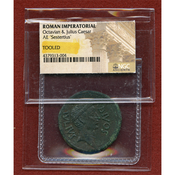 オクタビアヌス(後の初代ローマ皇帝アウグストゥス)がBC44年のカエサル暗殺後に自分がカエサルの正統後継者であることを顕示するために発行した希少品です。