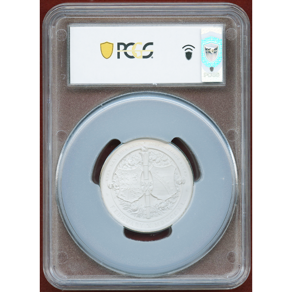 通常のメダルは磨いて銀本来の状態にしますが、このメダルはマットの白仕上げが施されており更に特注のガラスケース(ルネット)に収められており特別に制作されたものと分かります。
