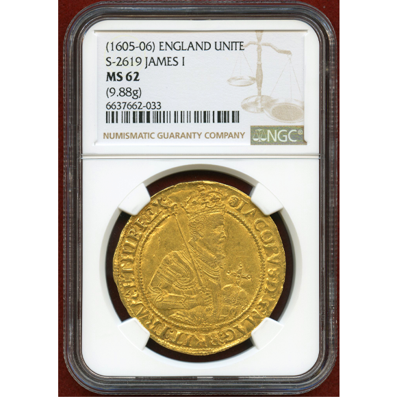 ユナイト金貨(Unite)の由来は、17世紀初頭のジェームズ1世(スコットランド王ジェームズ6世)がイングランドとスコットランドの2つの王冠を統合し、両国の統一(Unite/結束)を象徴して発行したことに由来します。