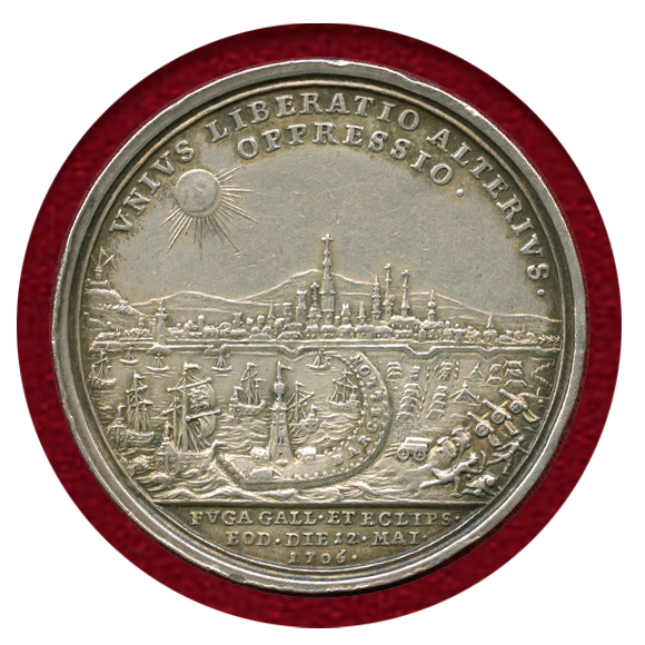 スペイン継承戦争中の大同盟の勝利を記念して鋳造され、フランス・スペイン軍はバルセロナ包囲戦の放棄を余儀なくされました。